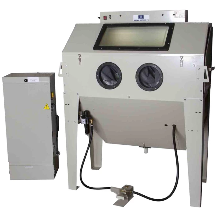 Sandblæsekabine industrimodel 423C er en effektiv sandblæsekabine med kraftigere fødeslanger og specialfremstillet sugebundstykke i aluminium for kraftigere og mere jævn blæsestråle. Kvalitets sandblæsekabine med fritstående filterkabinet. Kan blæse med mange typer blæsemedier som f.eks. stålsand, aluminium oxid, glasperler. Maskinen leveres komplet med blæsepistol, fodpedal til styring af blæsepistol, filter, regulator med vandudskiller og handsker.