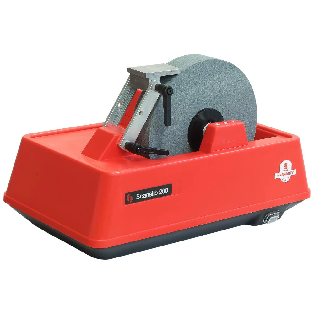 Scanslib vådsliber med standardsten korn 220 til slibning af knive, saks, økser, maskinknive, træbearbejdningsværktøj osv. Indstil slibeanlægget til den ønskede slibevinkel ved hjælp af den medfølgende skabelon. Et stort antal slibeaggregater til slibning af andre skærende værktøjer tilbydes som ekstra udstyr. Fås i flere varianter hhv. Model 150 med ø152 mm skive, Model 200 med ø200 mm skive eller Model 200S med ø200 mm skive og ø50 mm gummipolerrulle.