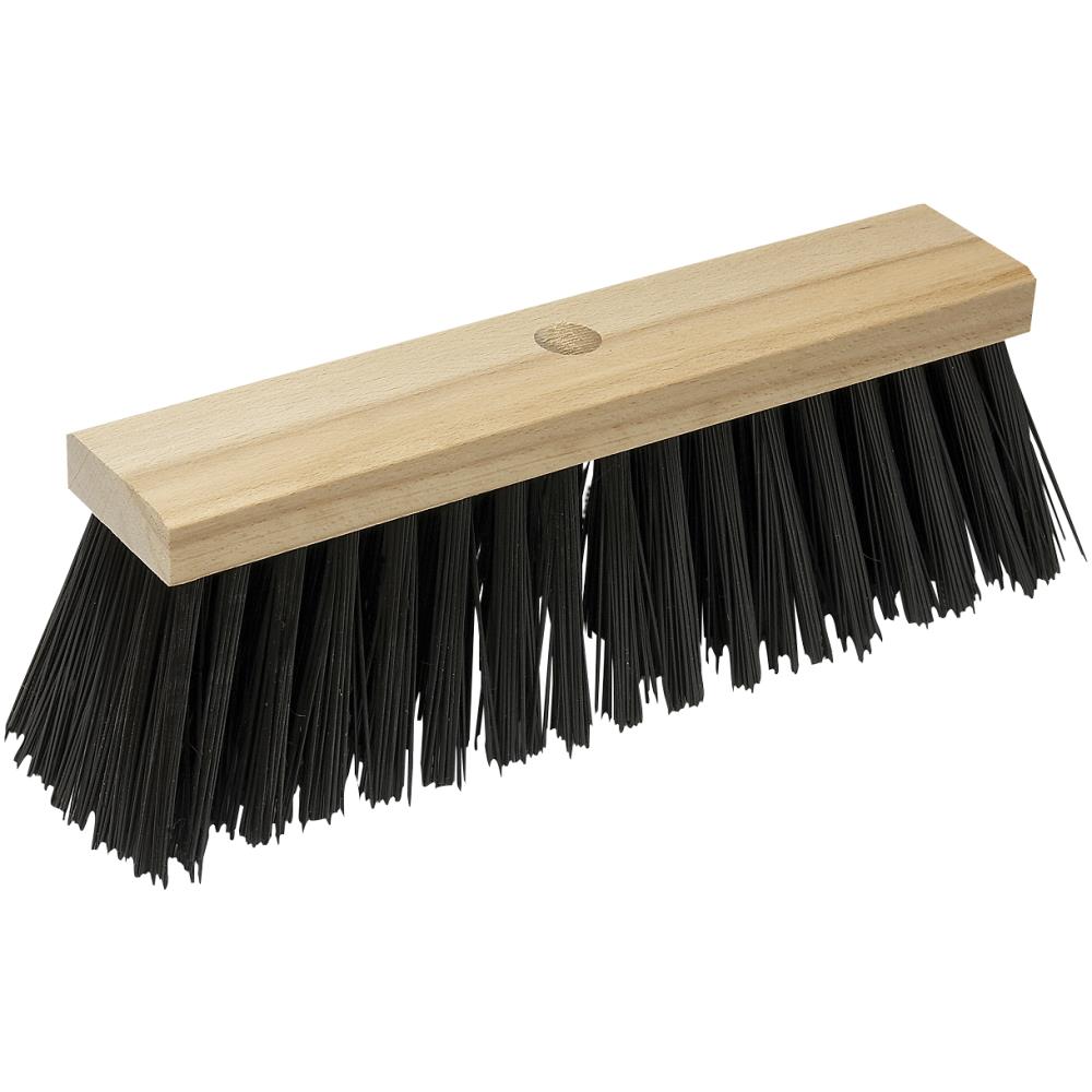 Gadekost i træ med ekstra stive brune PVC-børster, som er velegnede til ujævne overflader som asfalt og brolægning. Med hul, som passer til træskafter uden gevind.