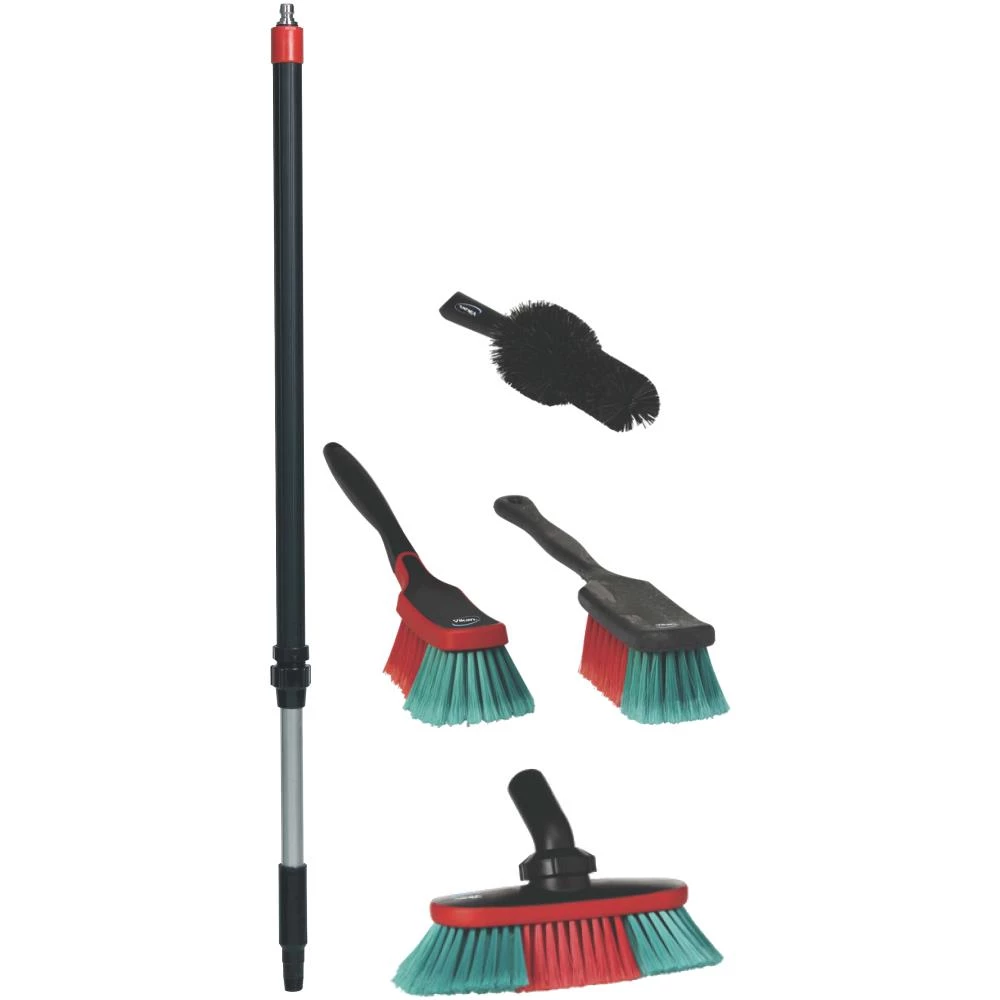 Vikan Transportsystem-startpakke. Pakken indeholder: 1 stk. autobørste med langt skaft (522252), 1 stk. multibørste/fælgbørste (525252), 1 stk. autobørste med vandgennemløb (526852), 1 stk. fælgbørste 65 mm (525052) og 1 stk. aluteleskopskaft med vandgennemløb (297152C).