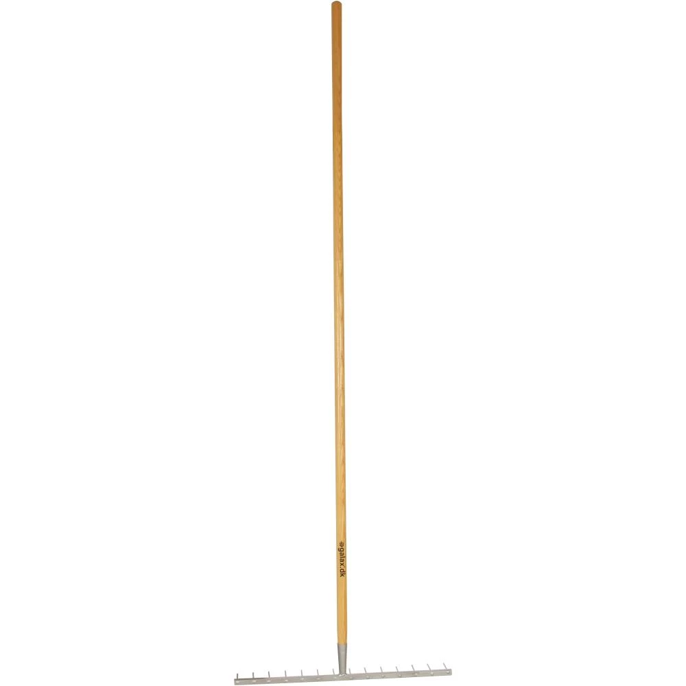 14-tands anlægsrive med skaft af lakeret asketræ. Ideel til anlægsarbejde, men kan også bruges til samling af grene og kviste på plæner eller i grus.