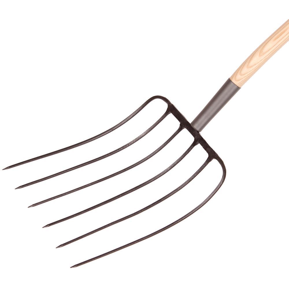 6-grenet ensilage-/majsgreb med lakeret asketræsskaft med D-greb i jern. Grebhoved 450×350 mm.