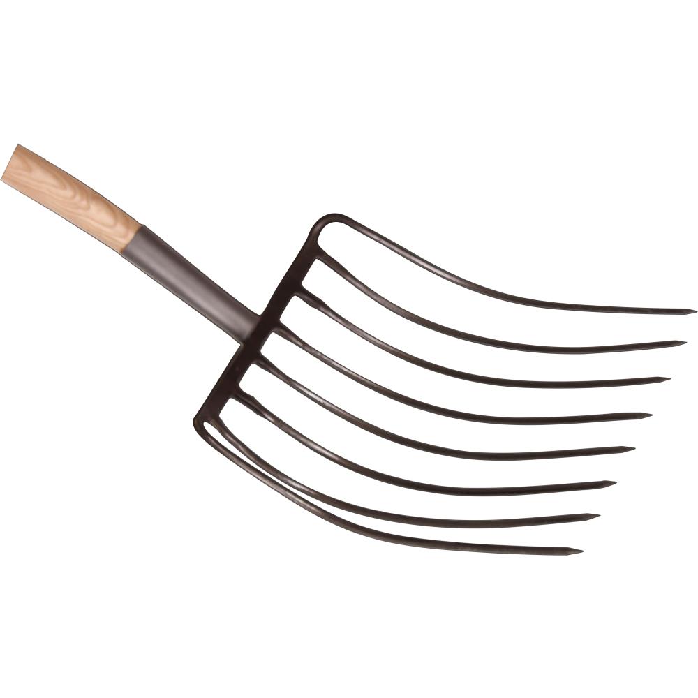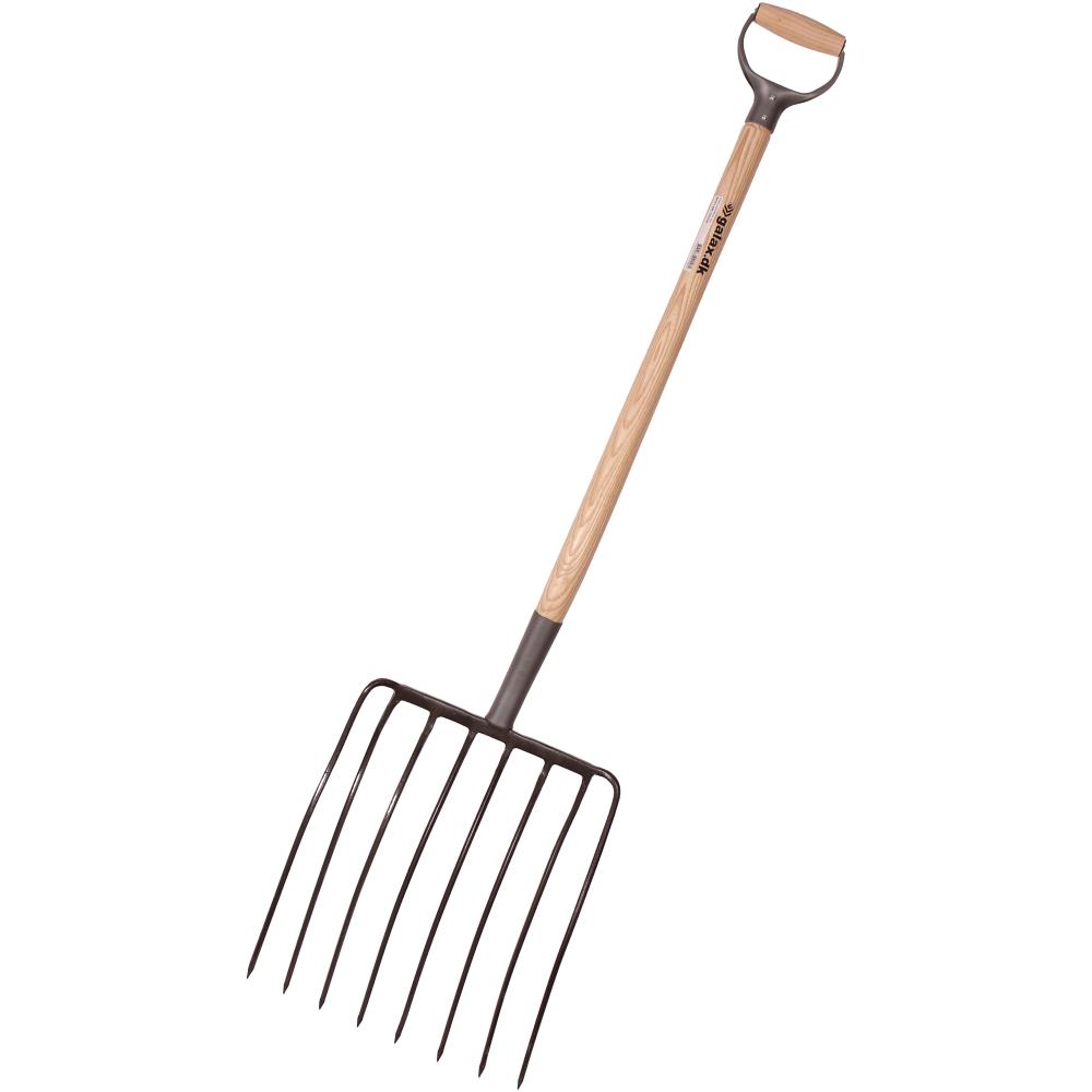8-grenet ensilage-/minkgreb med lakeret asketræsskaft med D-greb i jern. Grebhoved 450×360 mm.
