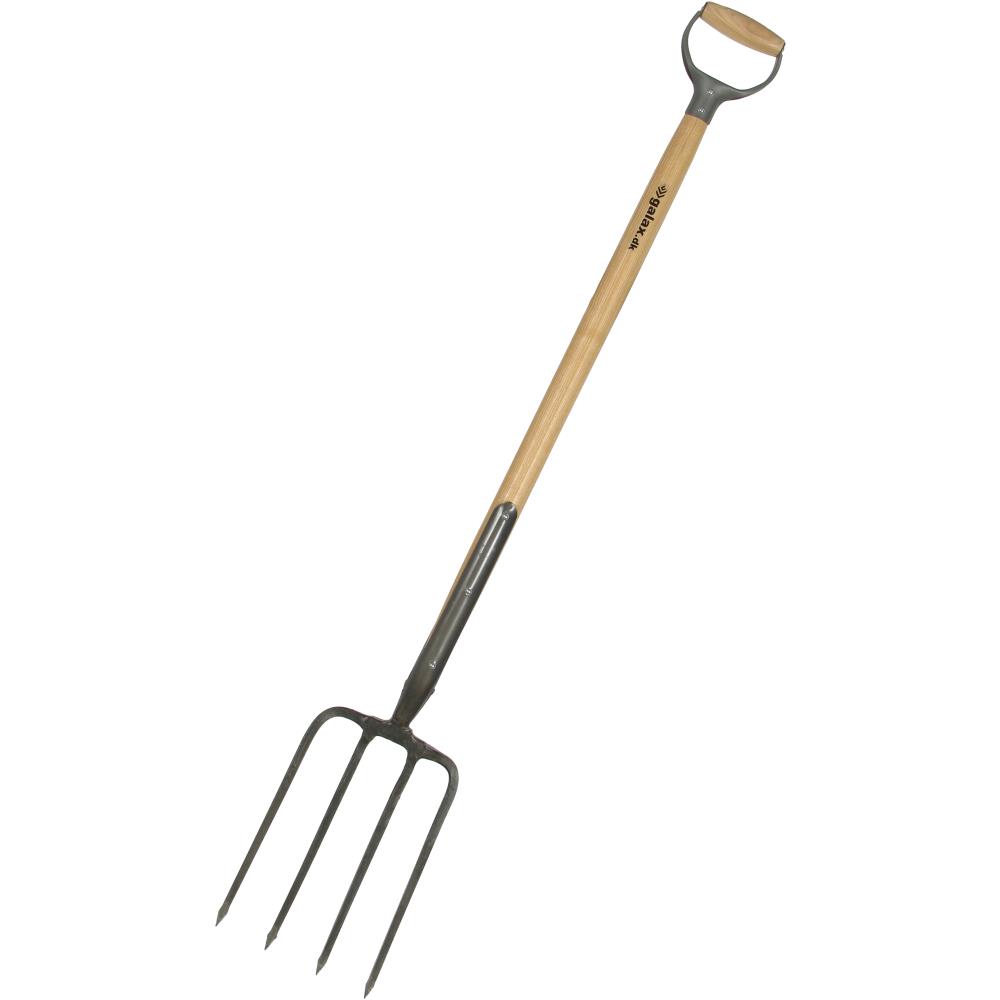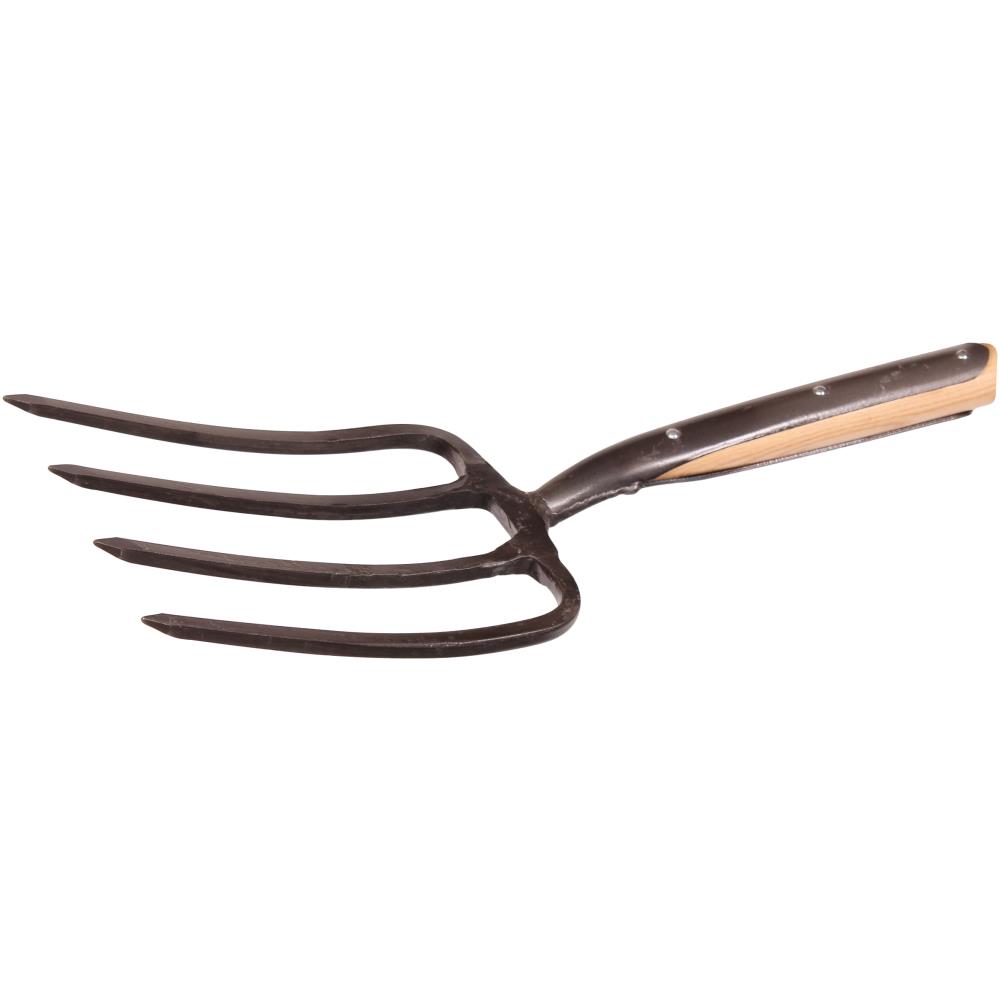 4-grenet entreprenørgreb med kraftige tænder, der afsluttes med spids. Lakeret asketræsskaft med D-greb i jern. Grebhoved 310×200 mm.