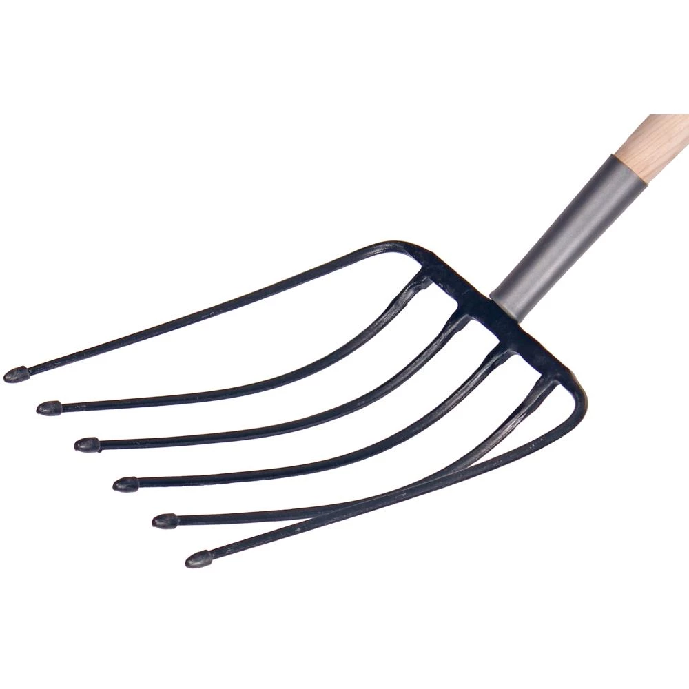 6-grenet fiskegreb med knopper, der skåner fiskene mest muligt. Lakeret asketræsskaft med D-greb i jern. Grebhoved 390×350 mm.