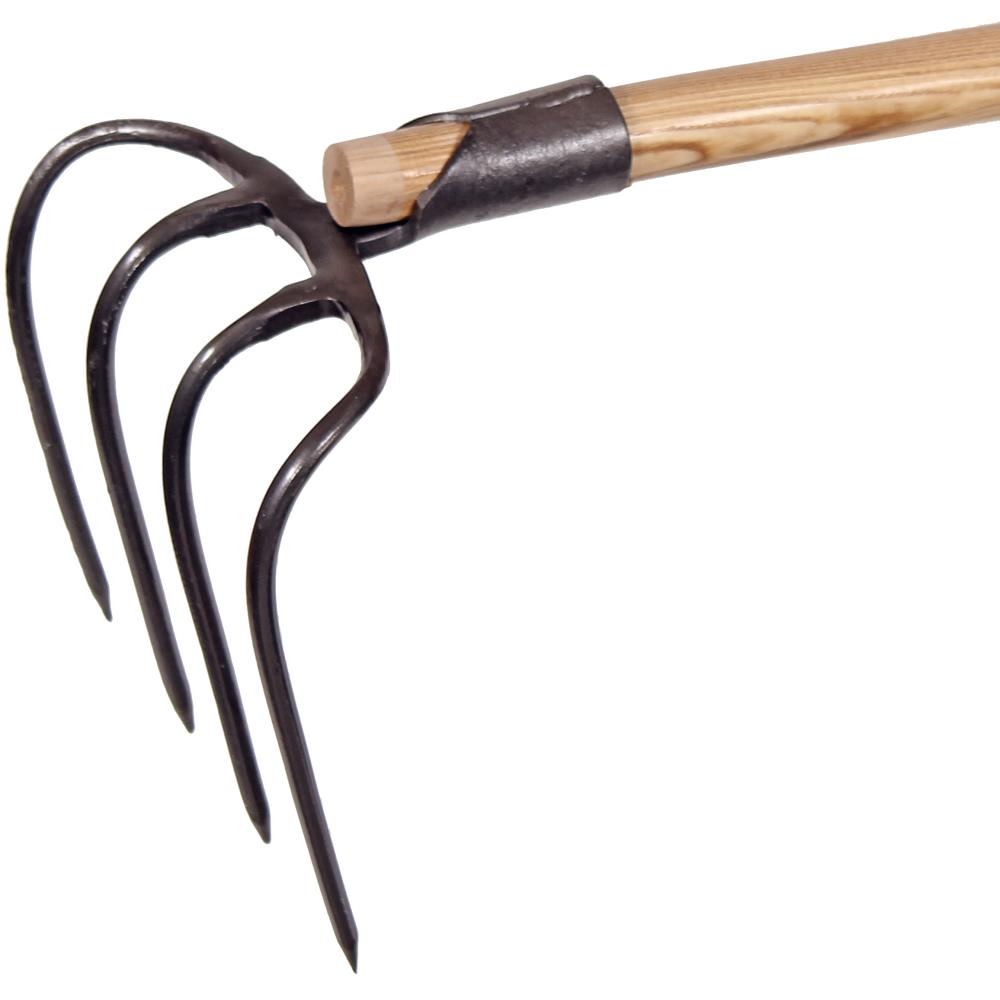 4-grenet gødningshakke med runde tænder og lakeret asketræsskaft. Greb-/hakkehoved 270×190 mm.