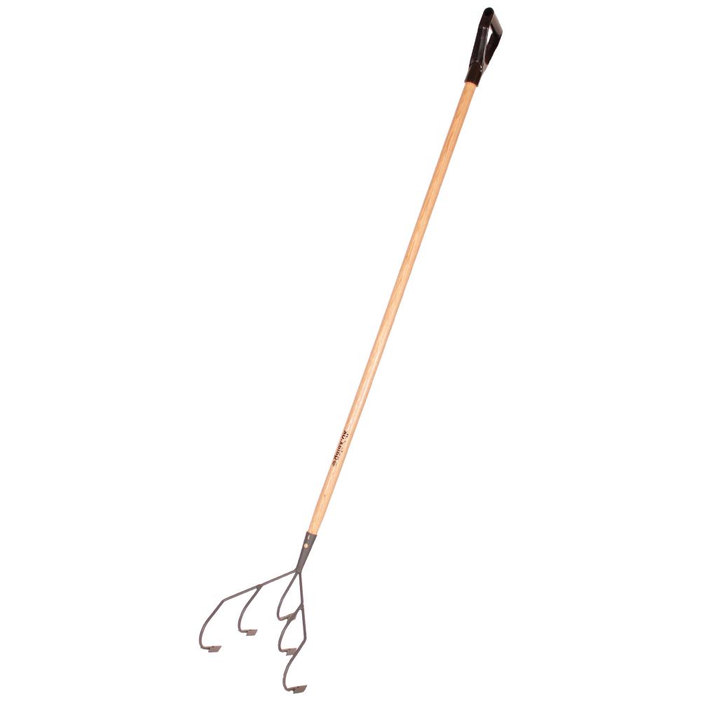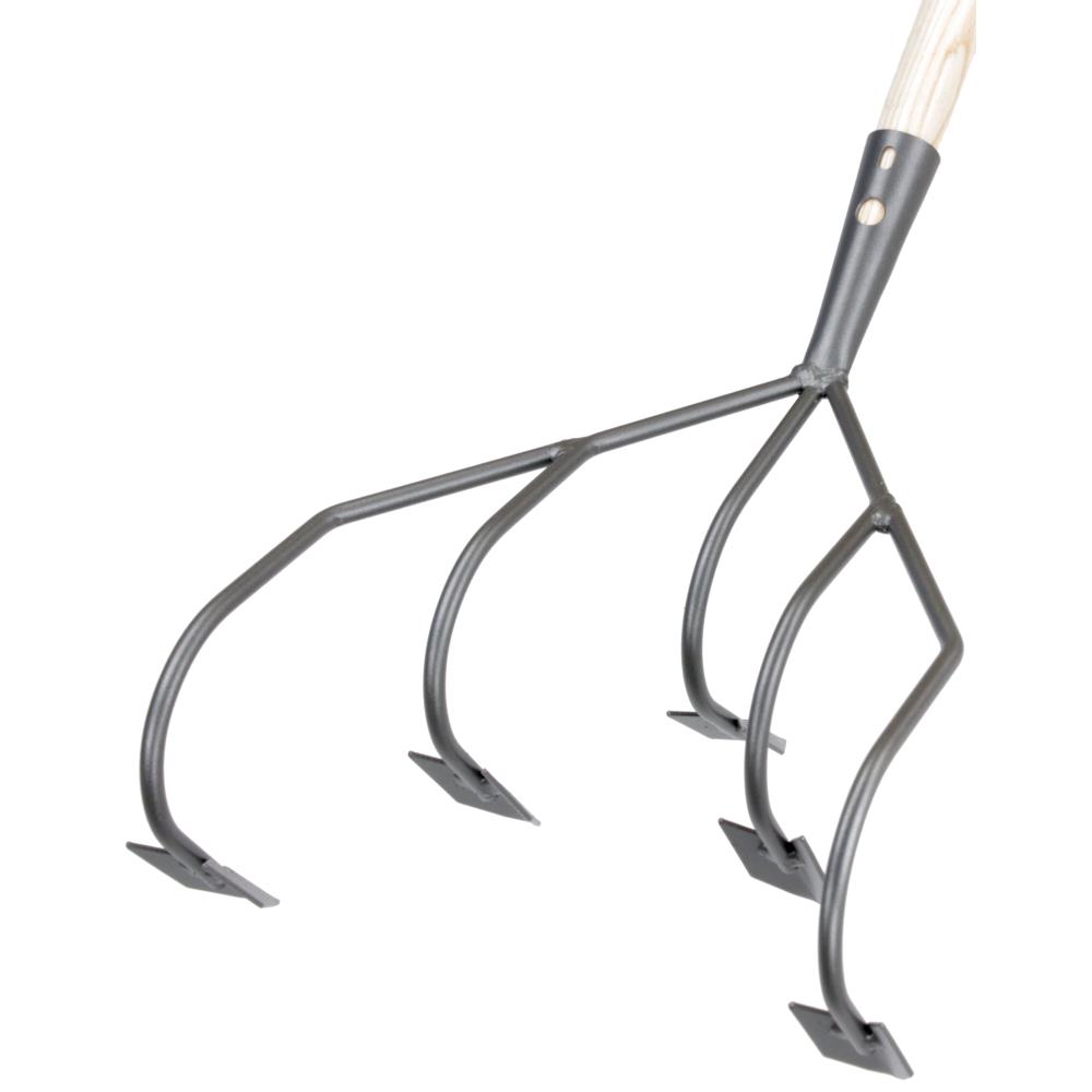 5-grenet kultivator til at fjerne ukrudt og til at lufte jorden, så frøene får ilt og mulighed for at spire. Model med lakeret asketræsskaft med D-greb i jern.