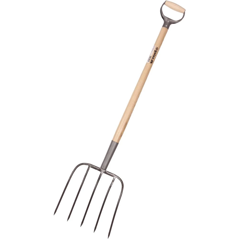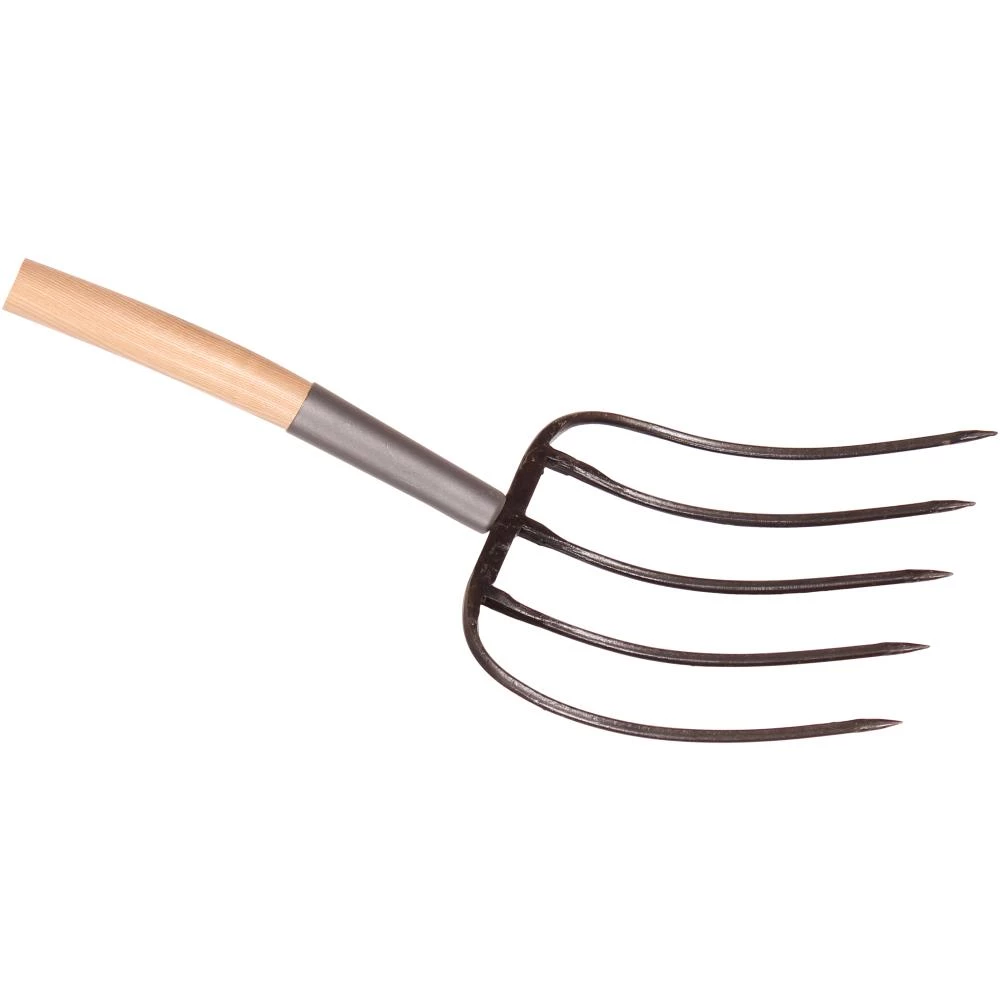 5-grenet læssegreb med lakeret asketræsskaft og D-greb i jern. Grebhoved 300×300 mm.