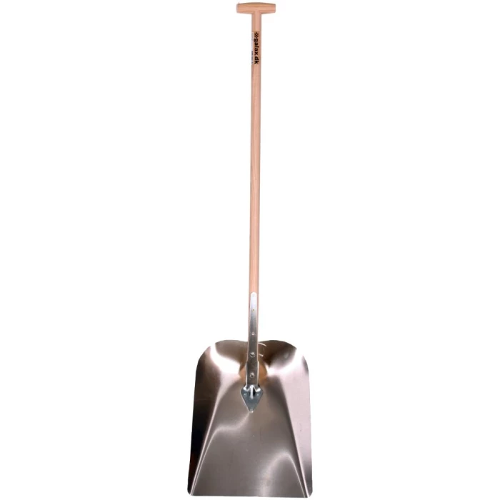 Let aluminium graveskovl til fx korn, sand eller sne. Asketræsskaft med krykke. Fås i forskellige størrelser.