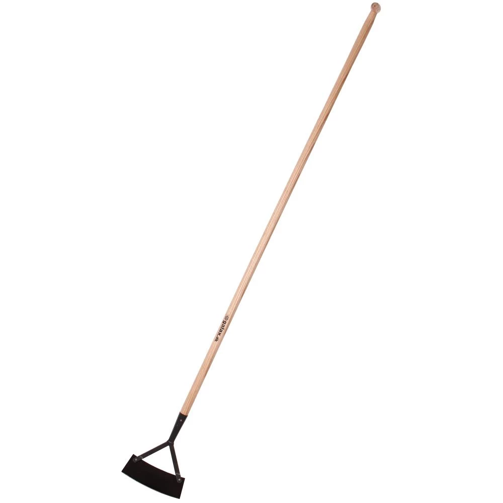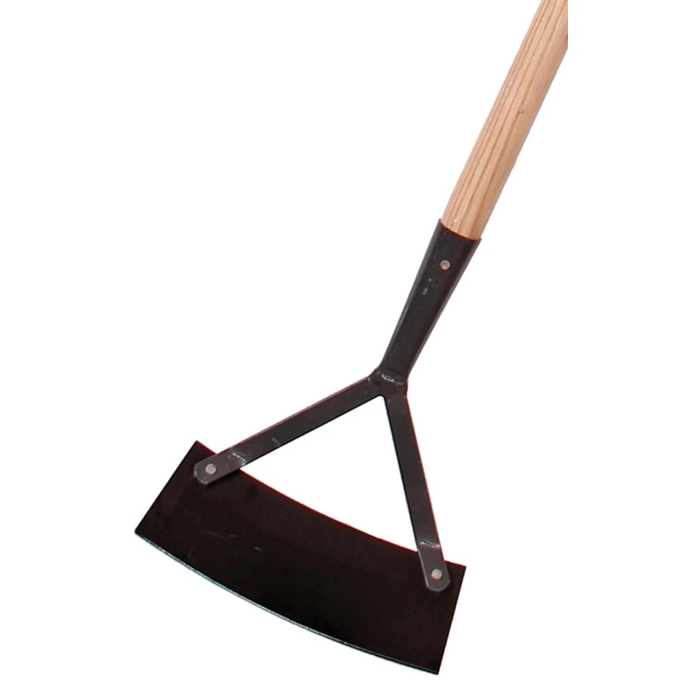 Skuffejern med buet skær og asketræsskaft med krykke. Skuffejernet bruges til at fjerne ukrudt i havegange og andre store flader hvor alle planter skal væk.