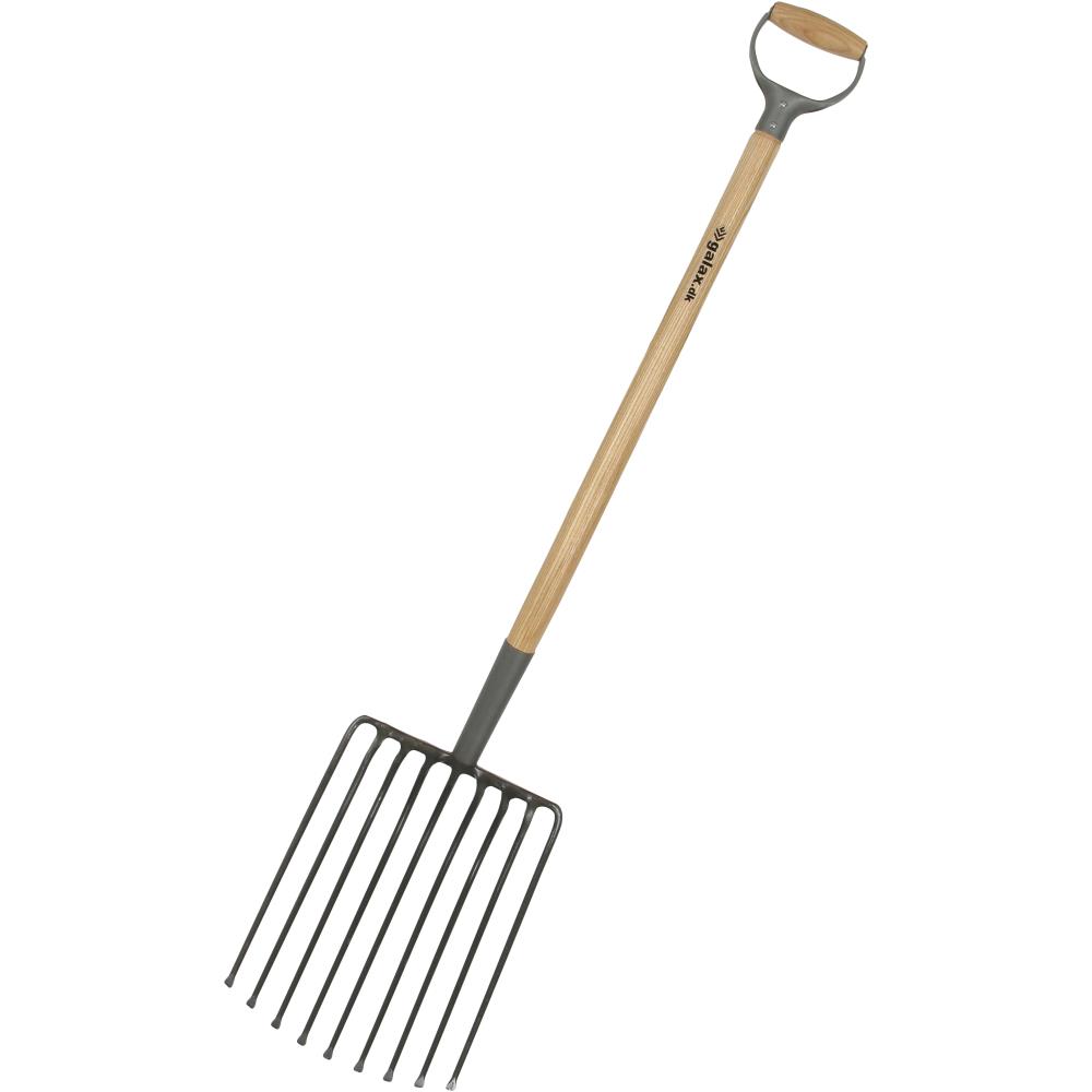 9-grenet stengreb til rensning af stenet jord. Model med runde tænder der afsluttes fladt og lakeret asketræsskaft med D-greb i jern. Grebhoved 370×270 mm.