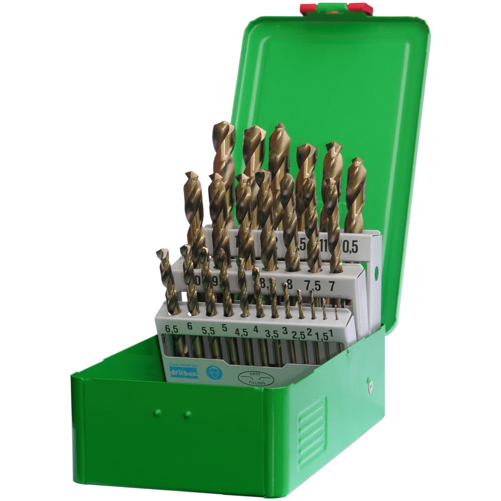 Borsæt med 25 stk. spiralbor (1-13 mm × 0,5 mm). Til boring i bl.a. stål, aluminium og rustfrit stål. Leveres i stålkassette.