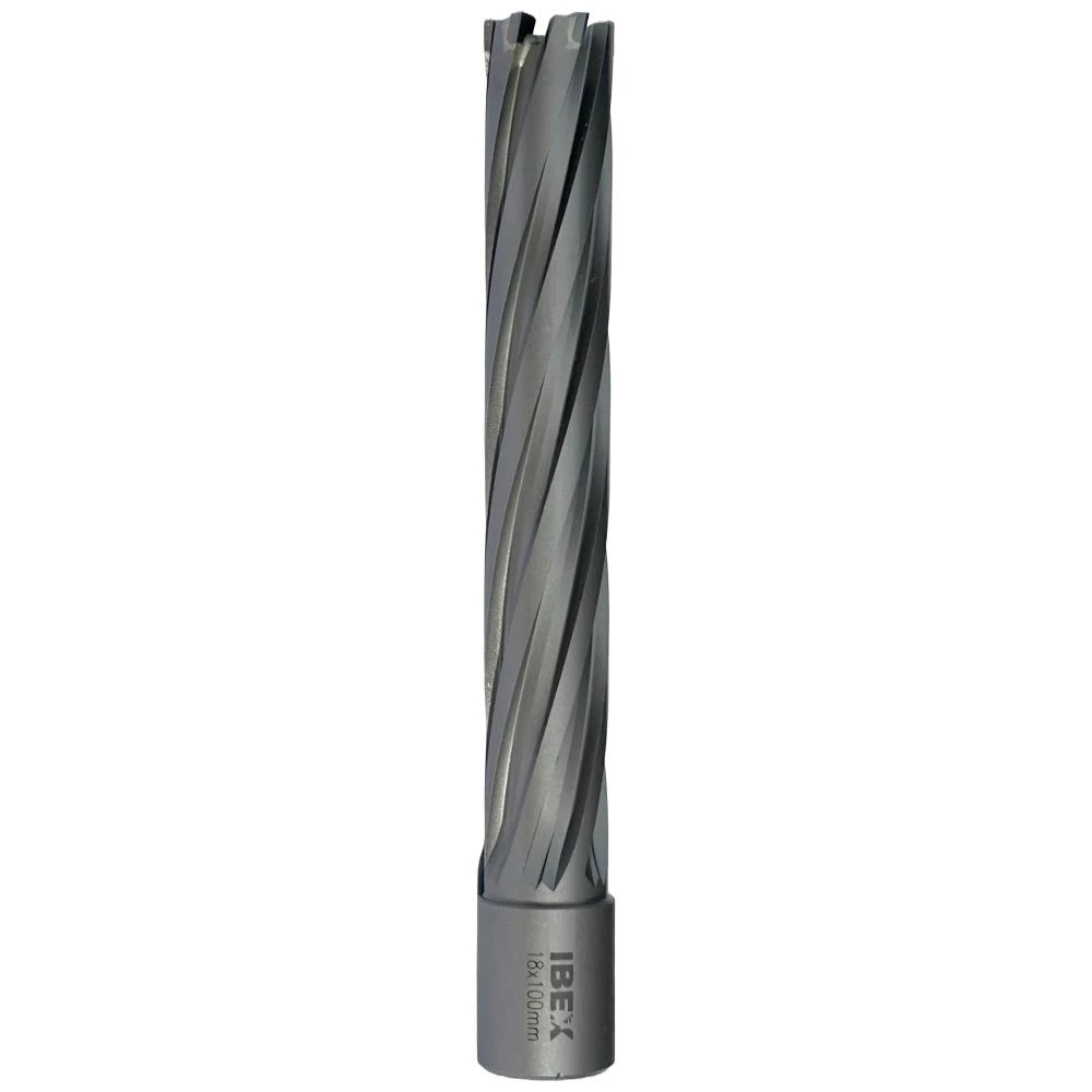 Kernebor med skæredybde 100 mm. Hårdmetal med 19 mm (3/4″) Weldonskaft. Benyt Ibex centrerstift. Fås i flere dimensioner.
