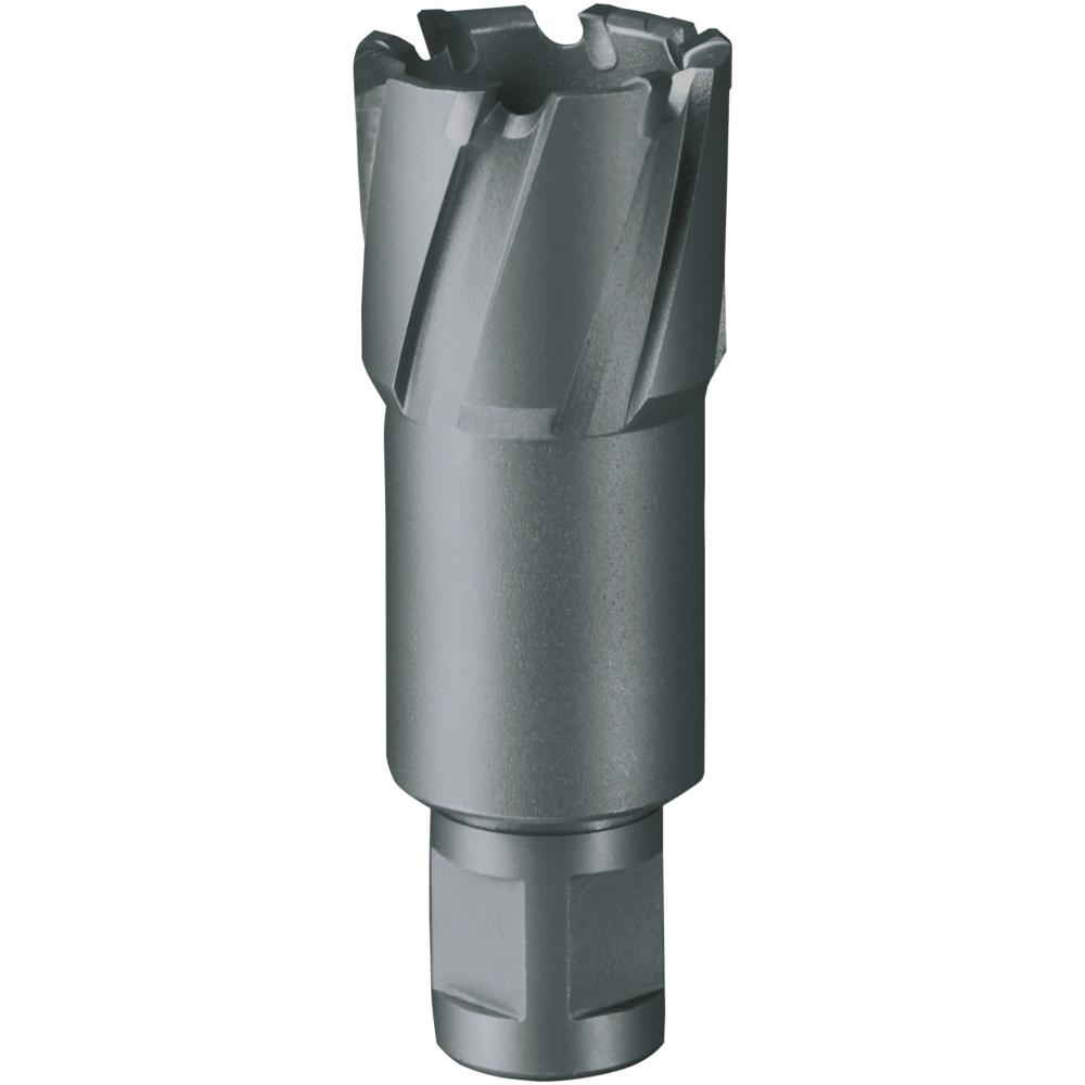 Kernebor med HM-skær og Weldonskaft ø12 mm med 50 mm skæredybde. Velegnet til boring i jernbaneskinner, hardox og weldox 400, stål, stålgods, højkromlegeret stål så som V2A og V4A og højere legeret stål. Husk altid udkasterstift og vær opmærksom på skærehastighed og brug af kølemiddel. Fås i dimensionerne 12-50 mm.