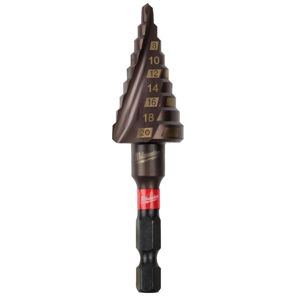 Shockwave Impact Duty trinbor til slagskruemaskiner og bore-/skruemaskiner. 1/4″ Hex-fæste med optimeret Shockzone stødabsorbering og overfladebelægning af titanium/aluminium-nitrat sikrer maksimal holdbarhed og levetid. Trinboret er designet med Rapid Strike Trip for hurtig opstart uden vandring og dobbelt spiral for slagskruemaskiner. Trin-markeringer på boret er laser-indgraverede og slides ikke væk over tid. Fås i flere varianter.