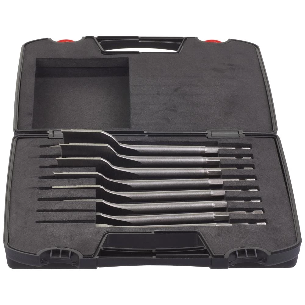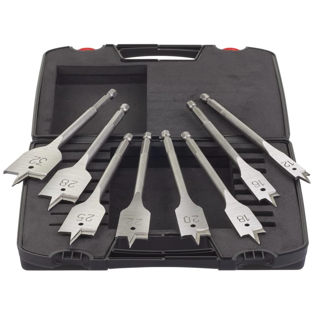 Fladbor for hurtig boring af store diametre. Velegnet til boring i hårdt og blødt naturtræ samt spånplader. Perfekt til dørlåse, forsænkning samt elektriker- og blikkenslagerarbejde. 1/4″ Hex skaft (DIN E 6.3) for direkte fastgørelse i elværktøjet og for sikkert patrongreb. Slebet midterpunkt for præcis placering af boret og skarpe vinger, for optimal skærekapacitet. Sæt med 8 dele. Ø 12 / 16 / 18 / 20 / 22 / 25 / 28 / 32 × 152 mm.