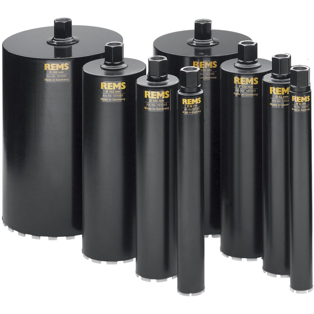Rems universal diamant kerneborkroner. Universal til mange materialer. Ideel til installatøren. Højtydende. Induktivt loddet. Universal anvendelig til tør- og vådboring, håndført eller med borestander. Til installation, metalhåndværk, industri. Beton, armeret beton, murværk af enhver art, natursten, asfalt, støbt gulv af enhver art m.m.