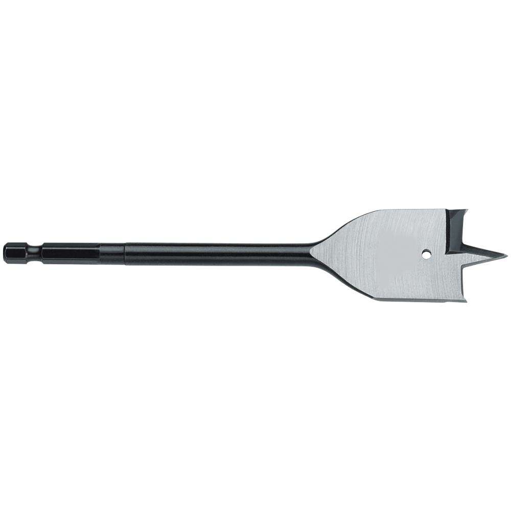 Træbor med centrerspids til præcis forboring og to sideskær til hurtig og splintfri boring i blødt træ, spånplader, krydsfiner, letvægtsbyggematerialer osv. 1/4″ (6,35 mm) sekskantet skaft passer til almindelige borepatroner og E 6,3-holdere.