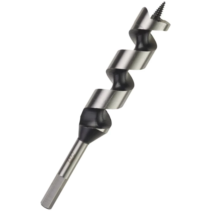 Træsneglebor til tunge præcisionsboringer i blødt og hårdt træ, store planker, bjælker, gulvbrædder, spånplader og krydsfiner. Lewis-sporkonstruktion for hurtig fjernelse af spåner og 6kt-skaft for sikkert greb i borepatronen.