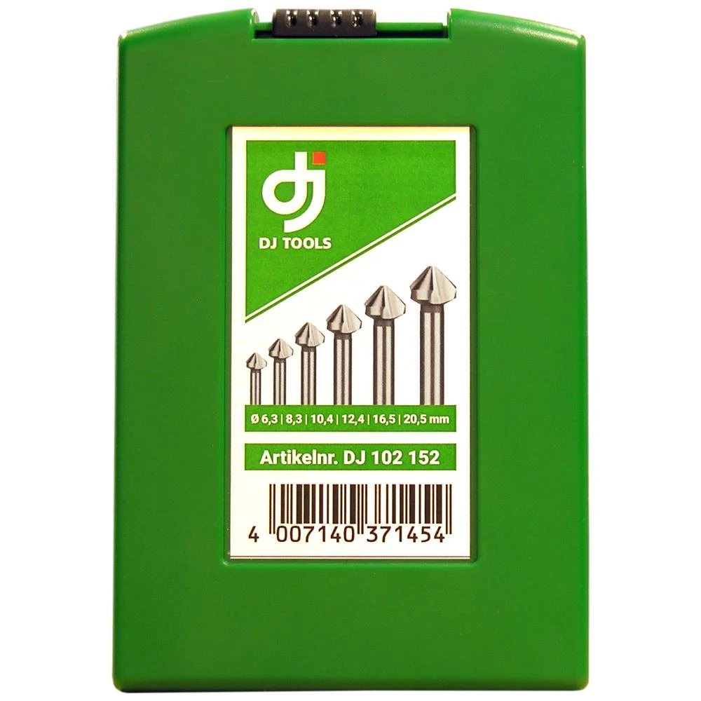 DJ Tools forsænkersæt. Indhold forsænker 90° HSS 6,3 mm / 8,3 mm / 10,4 / 12,4 mm / 16,5 mm / 20,5 mm. Anvendes til grat- og ruflefri forsænkning. Velegnet til stål, støbejern, ikke jernholdige metaller og letmetal. Bedste resultat opnås ved lav skærehastighed.
