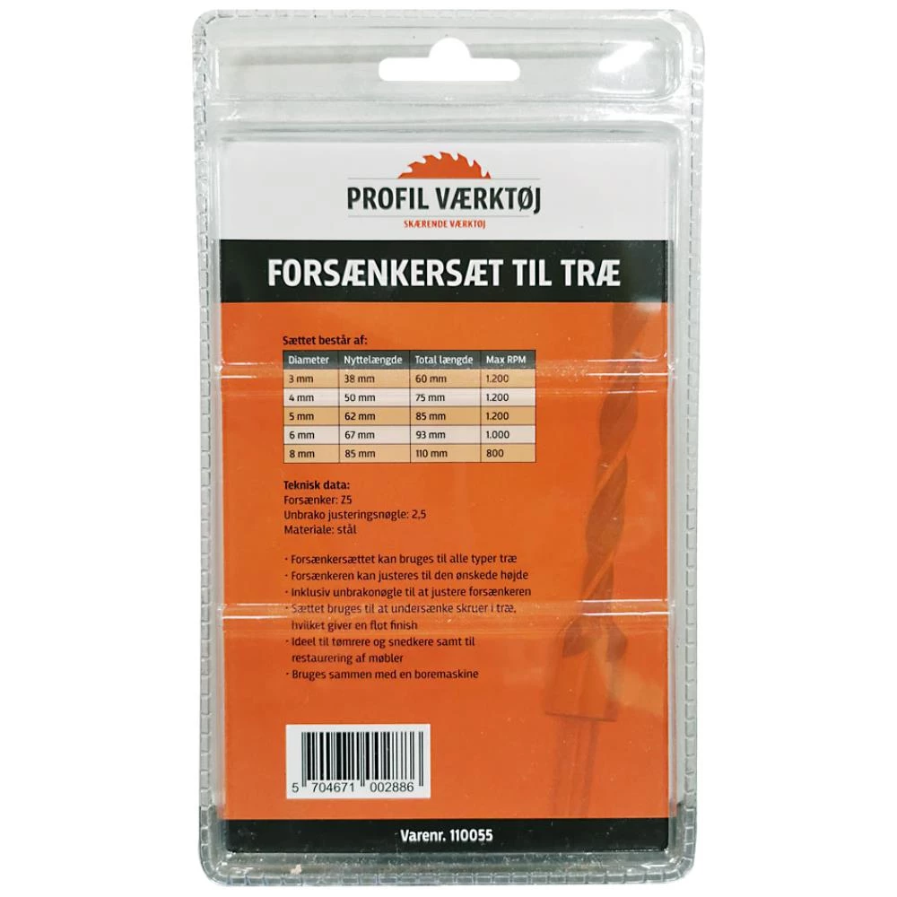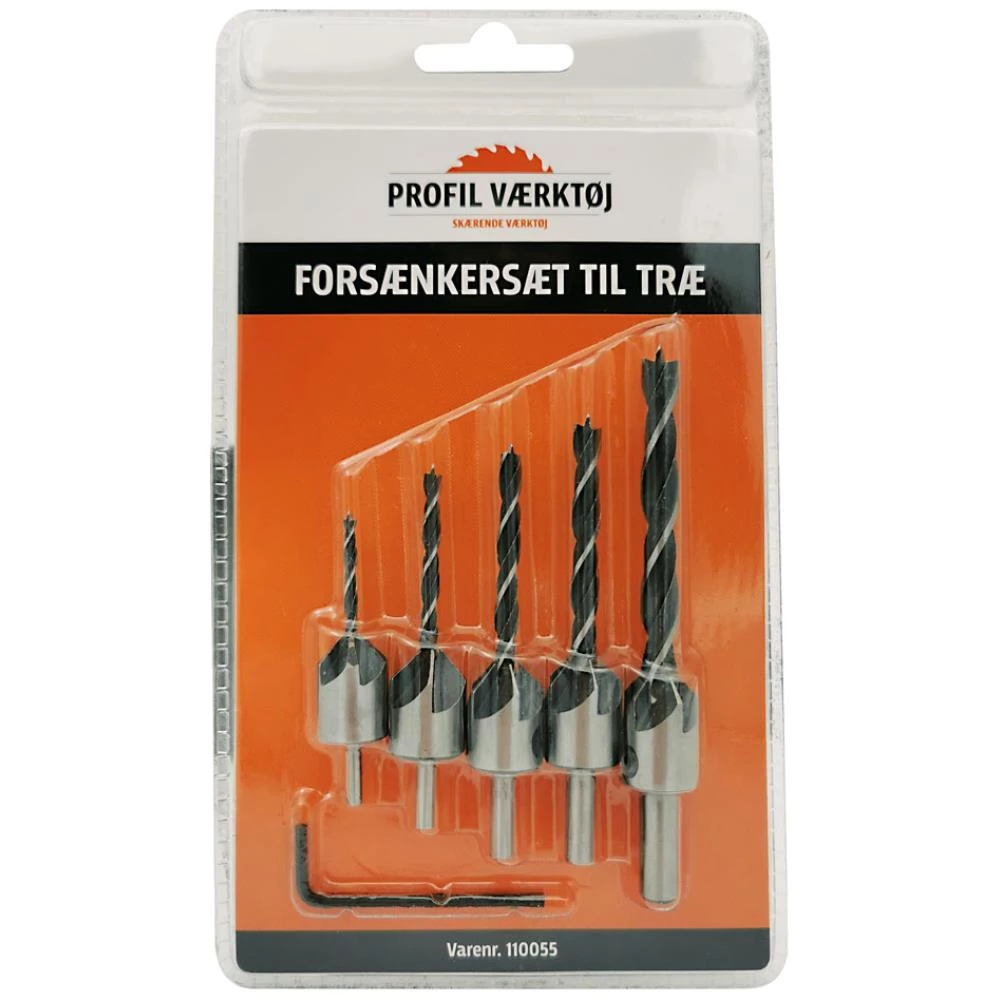 Forsænkersæt til træ. Indeholder størrelse 3 – 4 – 5 – 6 – 8 mm.
