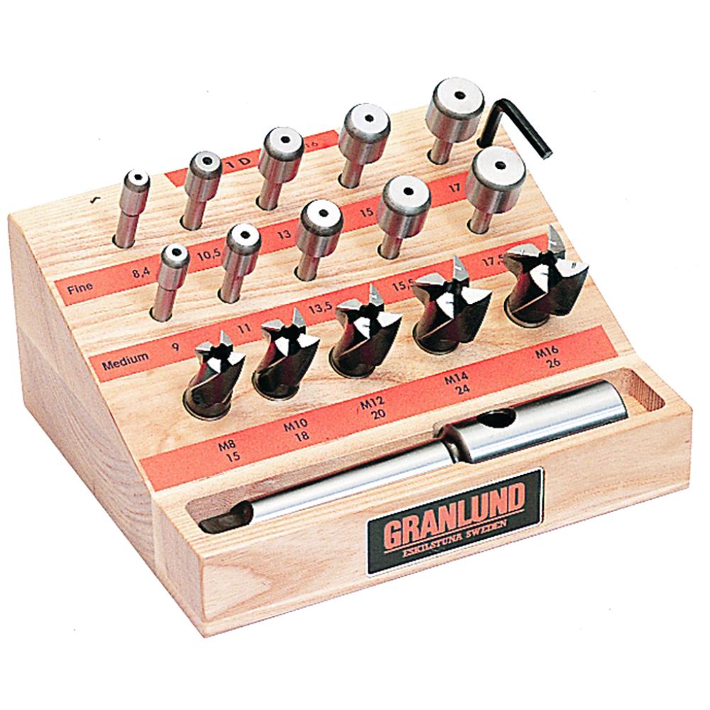 Granlund tapbor system nr. 1. Komplet plansænkningssortiment med tapbor type N, styretapper type F og værktøjsholder type 1 A – MK2. Til boltehoveder MC6S bruges følgende størrelser: M8: ø15,0 – M10: ø18,0 – M12: ø20,0 – M14: ø24,0 mm. HSS, hærdede og slebne, tolerance h8. Pakket i praktisk holder af træ.