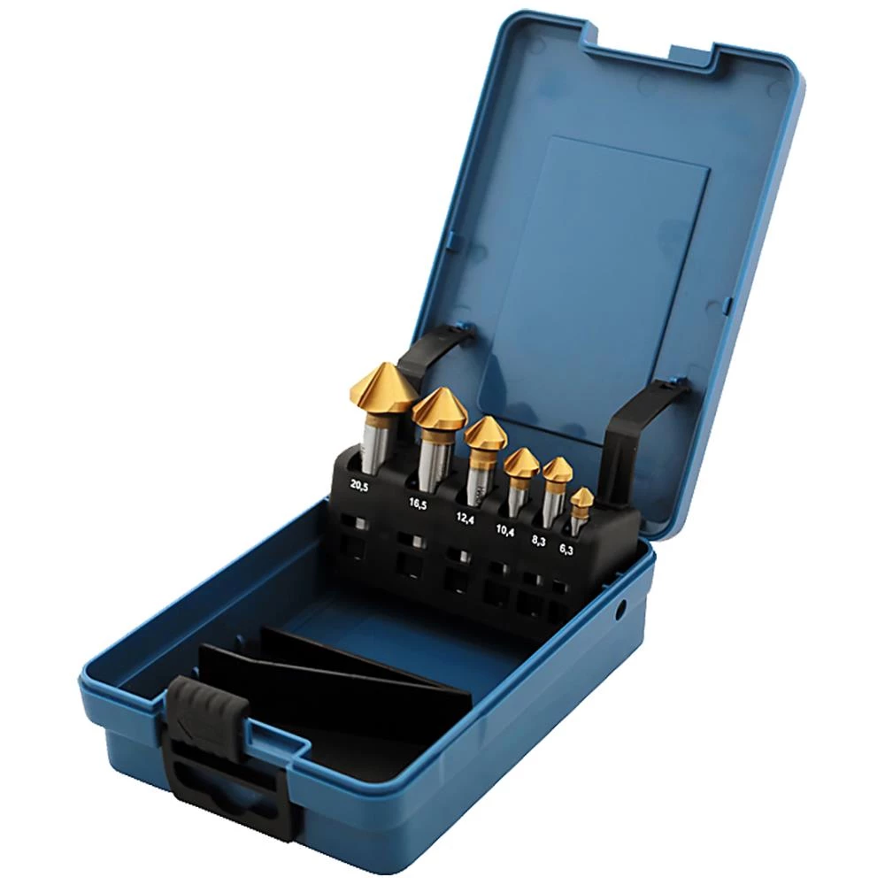 Forsænkersæt med 6 dele (6,3/8,3/10,4/12,4/16,5/20,5). 3-skærs forsænkere med 90° spidsvinkel og cylindrisk skaft. Form C efter DIN 335 standard. Fremstillet af HSS med TiN-overflade, som forlænger standtiden og er velegnet til rustfri stål. Leveres i plastæske.