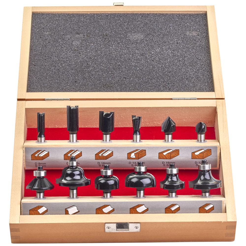 Fræsersæt til træ. Med 8 mm skaft. Sættet består af 12 stk. forskellige fræserstifter. Leveres i trækasse.