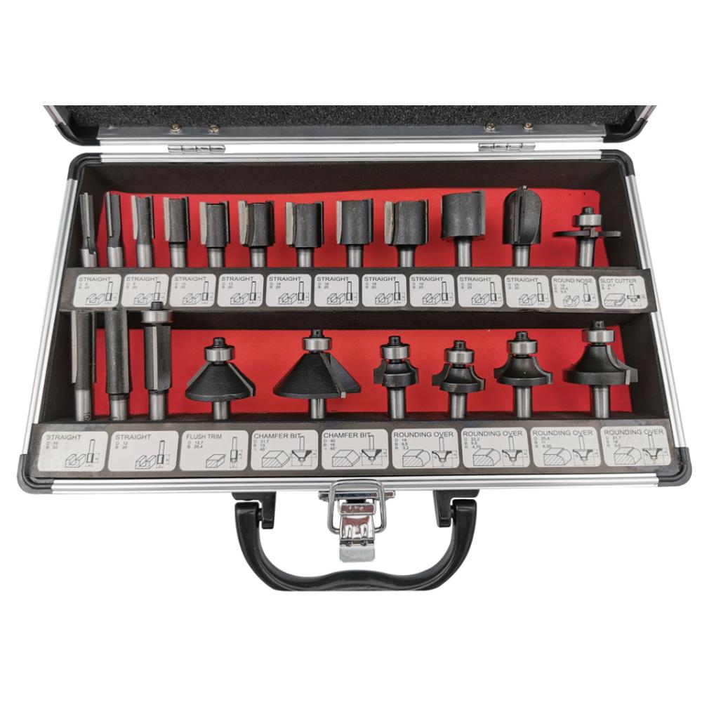 Proftool overfræsersæt med 21 assorterede dele med 8 mm skaft.