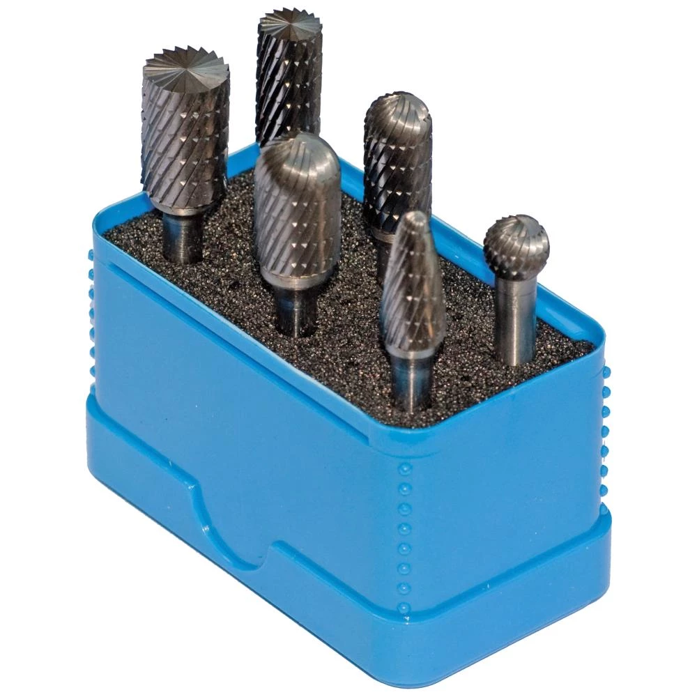Praktisk sæt med 6 stk. roterende hårdmetalfræsere til jern og stål. Skaftdiameter: 6 mm. Indhold: 6 dele: AE1224, B1224, CR1022, AE1022, B1022 og E1022.