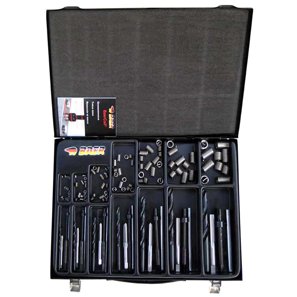 BaerCoil gevindreparationssæt med metrisk gevind i størrelserne M5-M12. Til forstærkning af gevind i bløde materialer som aluminium og støbejern og til reparation af ødelagte gevind. Inkl. 5 stk. bor, 5 stk. monteringsværktøj, 5 stk. dorn og 40+25 stk indsatse (længde på indsatse er 1,5 og 2,5 × diameter).