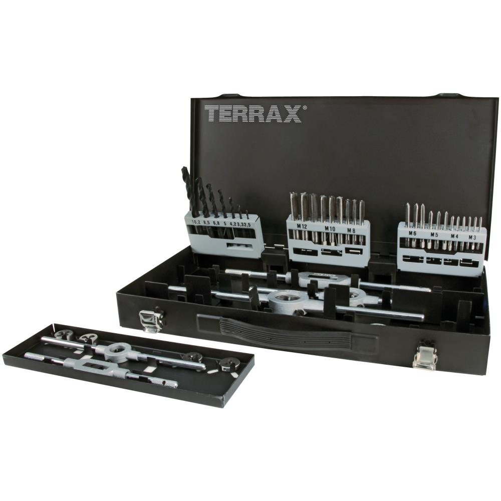 Terrax gevindværktøjssæt i stålkuffert med 37 dele HSS M3-12. Indeholder håndtappe sæt med spids, mellem og bundtappe M3, M4, M5, M6, M8, M10, M12. Runde bakker HSS M3, M4, M5, M6, M8, M10, M12. Vindejern Nr. 1 + 2, Ø-klup Ø20×5 / Ø20×7 / Ø 25×9 / Ø30×11 / Ø 38×14 mm samt skruetrækker og gevindtæller.
