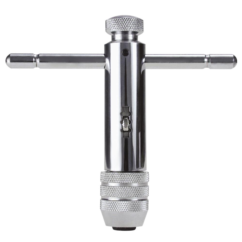 Værktøjsholder med skralde. Ideel til gevindskæring på svært tilgængelige steder. Dobbeltkæbe til firkantskaft. Udførelse: Stilbar til højre, venstre og fast. Skaft med forskydeligt tværgreb med riller i begge ender. Overflade: Forkromet.