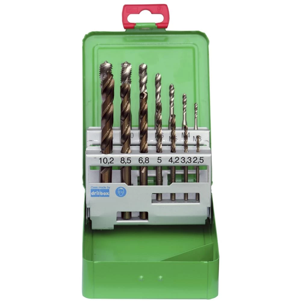 Sæt med 7 spiraltappe 35° HSSE M3, M4, M5, M6, M8, M10, M12 mm samt tilhørende gevindbor HSS Co5 Ø2,5 / 3,2 / 4,2 / 5,0 / 6,8 / 8,5 / 10,2 mm i plastkassette. Maskinsnittappe af koboltlegeret højpræstations-hurtigstål. På grund af den større varmehårdheds bestandighed opnås en længere standtid. Til gennemgangsgevind og bundhulsgevind i ulegeret og legeret stål op til 1000 N/mm² styrke. Gevindet bliver skåret i en arbejdsgang.