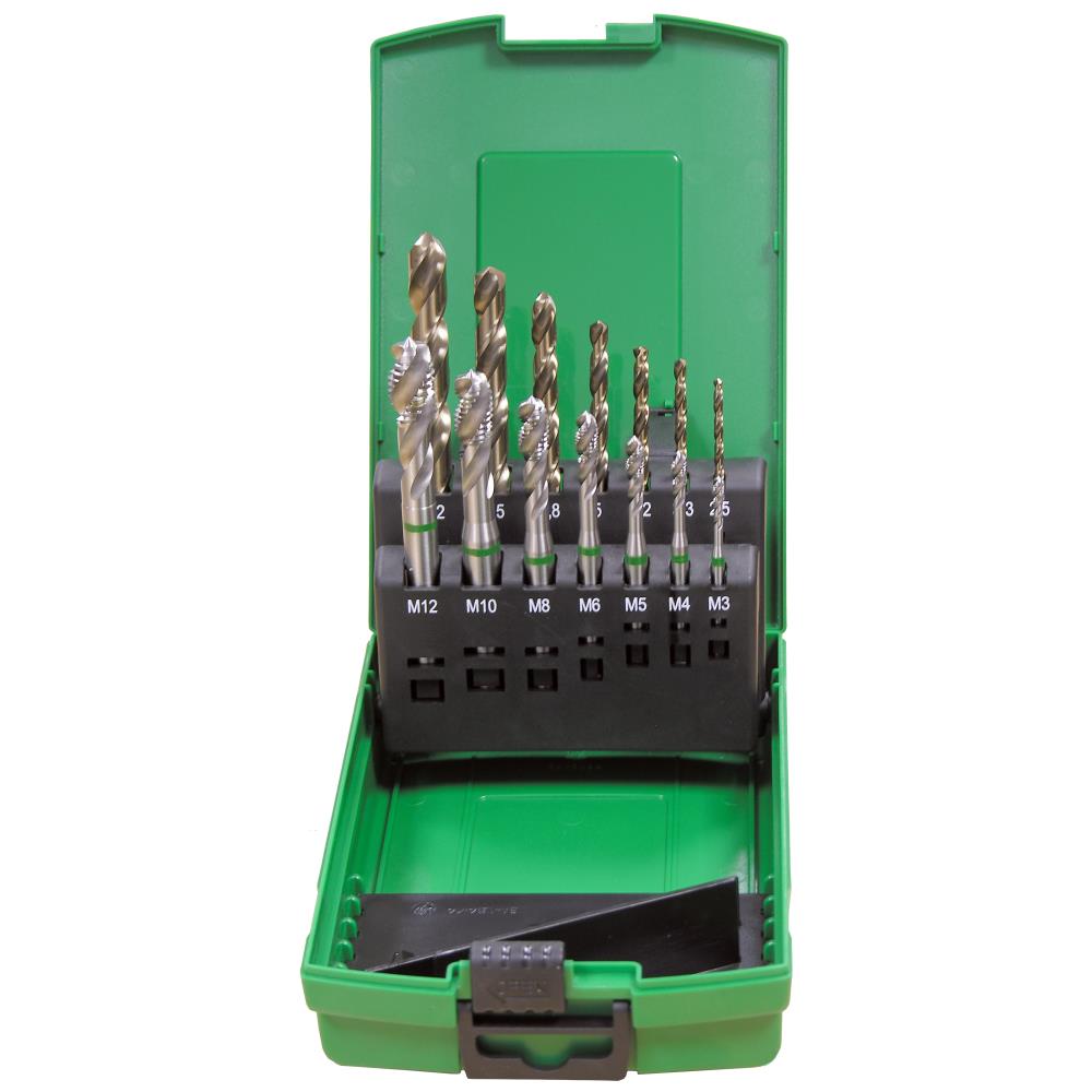 Sæt med 7 spiraltappe 35° HSSE M3, M4, M5, M6, M8, M10, M12 mm samt tilhørende gevindbor HSS Co5 Ø2,5 / 3,2 / 4,2 / 5,0 / 6,8 / 8,5 / 10,2 mm i plastkassette. Maskinsnittappe af koboltlegeret højpræstations-hurtigstål. På grund af den større varmehårdheds bestandighed opnås en længere standtid. Til gennemgangsgevind og bundhulsgevind i ulegeret og legeret stål op til 1000 N/mm² styrke. Gevindet bliver skåret i en arbejdsgang.