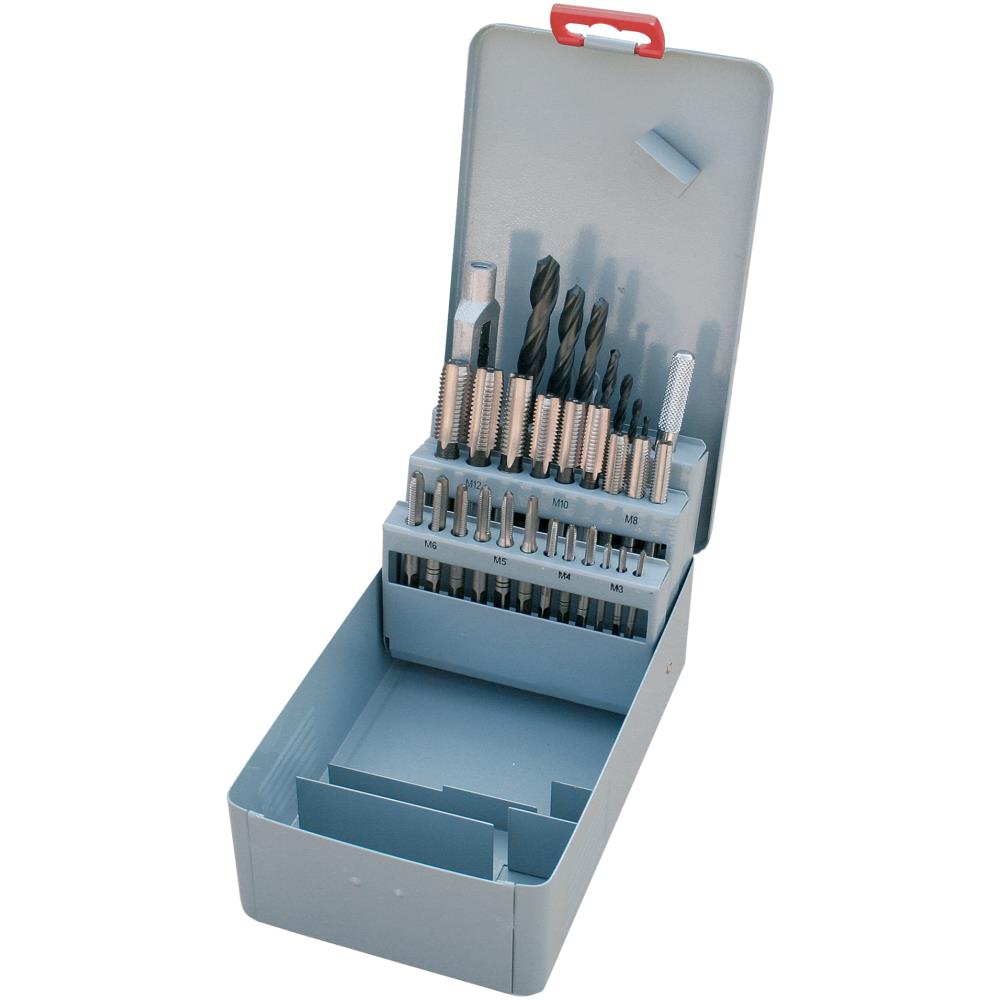 Snittapsæt indeholdende 1 stk. vindejern M3-M12, 7 stk. bor ø2,5 – 3,3 – 4,2 – 5,0 – 6,8 – 8,5 og 10,2 mm samt 7 stk. håndtappe M3 – M4 – M5 – M6 – M8 – M10 og M12. Spids, mellem og bund. Fremstillet af højhastighedsstål. Leveres i stålkassette.