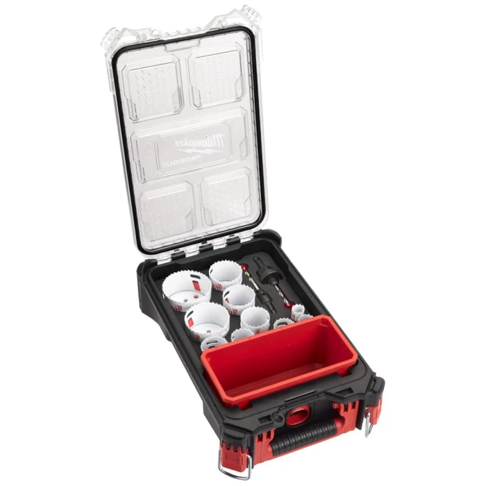 HoleDozer hulsavsæt i Packout-systemkuffert. Bimetal hulsave med positiv tandvinkel på 10°, som giver følgende fordele: Hurtigere og mere aggressiv savning. Forbedret varmeudledning under skæringen gør, at tænderne er skarpere længere. Tændernes dybere kurve betyder hurtigere spånafledning og dermed færre blokeringer og mindre varme. De specialformede tænder gør, at saven har mindre tendens til at hænge fast i tynde materialer. Tænderne er bøjet ud til siderne for at forhindre binding og friktion. Kræver lavere tryk – kombinationen af en aggressiv tandgeometri og god spånafledning betyder, at kun et minimalt tryk er nødvendigt for at bore. Hulsavens område hvor tænderne er placeret, er lavet af Matrix II højhastighedsstål i højeste kvalitet og indeholder 8 % kobolt. Dermed bibeholdes hulsavens hårdhed, selv under høj varmepåvirkning, som for eksempel ved boring i metal. Bimetalkonstruktion – HSS ståltænderne er lasersvejset ind i en lavt legeret stålkrop. Tænderne er siden hen vakuumhærdede til 65 HRC ved en temperatur på 600°C for at give dem maksimal holdbarhed og levetid. Den høje holdbarhed af Matrix II stål gør disse hulsave ideelle til boring i hårde materialer, såsom rustfrit stål og syremodstandsdygtige ståltyper, og bløde materialer som træ. 1,27 mm tyk og hærdet stålkrop mister ikke sin form. Samtidig er den smidig nok til ikke at knække under brug. Effektiv boredybde er 41 mm. Bagpladerne er fremstillet af tykt stål, som sikrer, at hullerne ikke udvides med tiden. En kraftig bagplade tilføjer styrke og stivhed minimerer vibrationerne. Bagpladen har 4 taphuller for optimal placering af adapteren. Perfekt rund og centreret bagplade hvilket er meget vigtigt for store hulsave. Velegnede til brug med både borestandere og håndholdte boremaskiner i stål op til 1.000 N/mm² styrke, rustfrit stål og syremodstandsdygtige ståltyper, ikke-jernholdige metaller, støbejern. aluminium, træ, MDF-plader, gipsplader, krydsfinér og PVC. Indeholder 10 stk. hulsave: ø20, ø25, ø32, ø35, ø40, ø44, ø51, ø54, ø68, ø76 mm. Adapter for ø14-30 mm. Adapter for ø32-152 mm. 1/8″ nøgle.