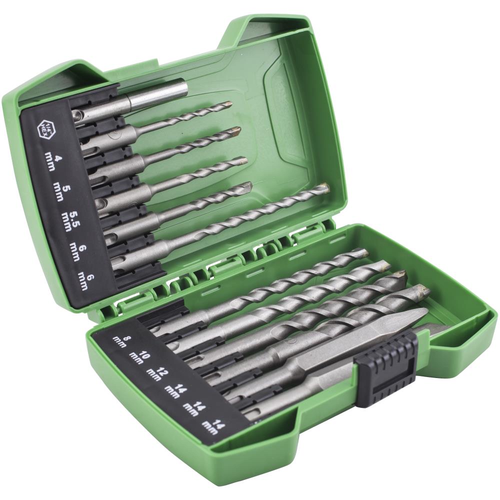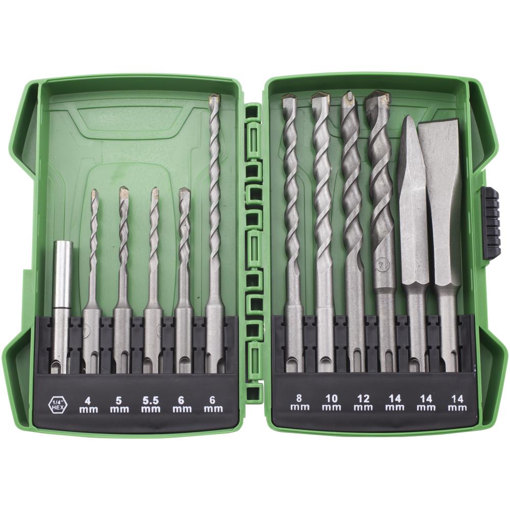 Boring i beton, mur, granit, natursten og andre stenmaterialer osv. Boring i klinker, fliser og marmor osv. Bor 110 mm: 4, 5, 5,5, 6. Bor 160 mm: 6, 8, 10, 12, 14. 1×bitsholder. 1×SDS-plus spidsmejsel. 1×fladmejsel.
