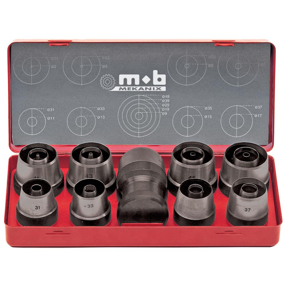 Huggepibesæt (lige størrelser) 3 + 4 / 6 / 8 / 10 / 12 / 14 / 16 / 18 / 20 / 22 / 24 / 26 / 28 / 30 / 32 / 34 / 36 / 38 / 40 / 42 / 44 / 46 / 48 / 50 mm. Med udskiftelige huggepiber til fremstilling af skiver og ringe i forskellige størrelser. Leveres i metalkassette.