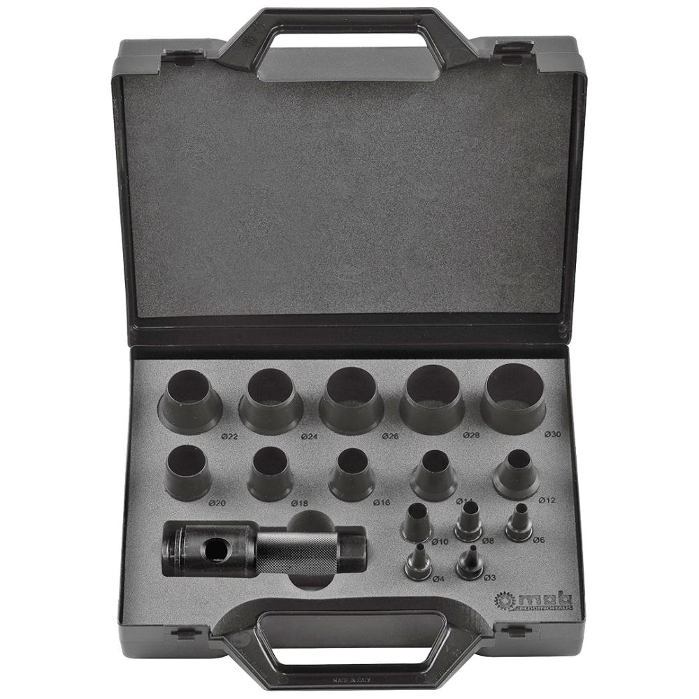 Huggepibesæt (lige størrelser) 3 + 4 / 6 / 8 / 10 / 12 / 14 / 16 / 18 / 20 / 22 / 24 / 26 / 28 / 30 mm. Med udskiftelige huggepiber til fremstilling af skiver og ringe i forskellige størrelser. Leveres i plastkassette.