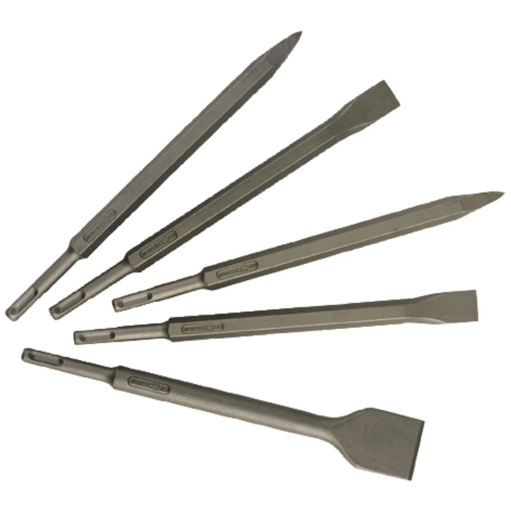 SDS-plus mejselsæt. Bestående af 2 spidsmejsel, 2 fladmejsel og 1 bredmejsel.