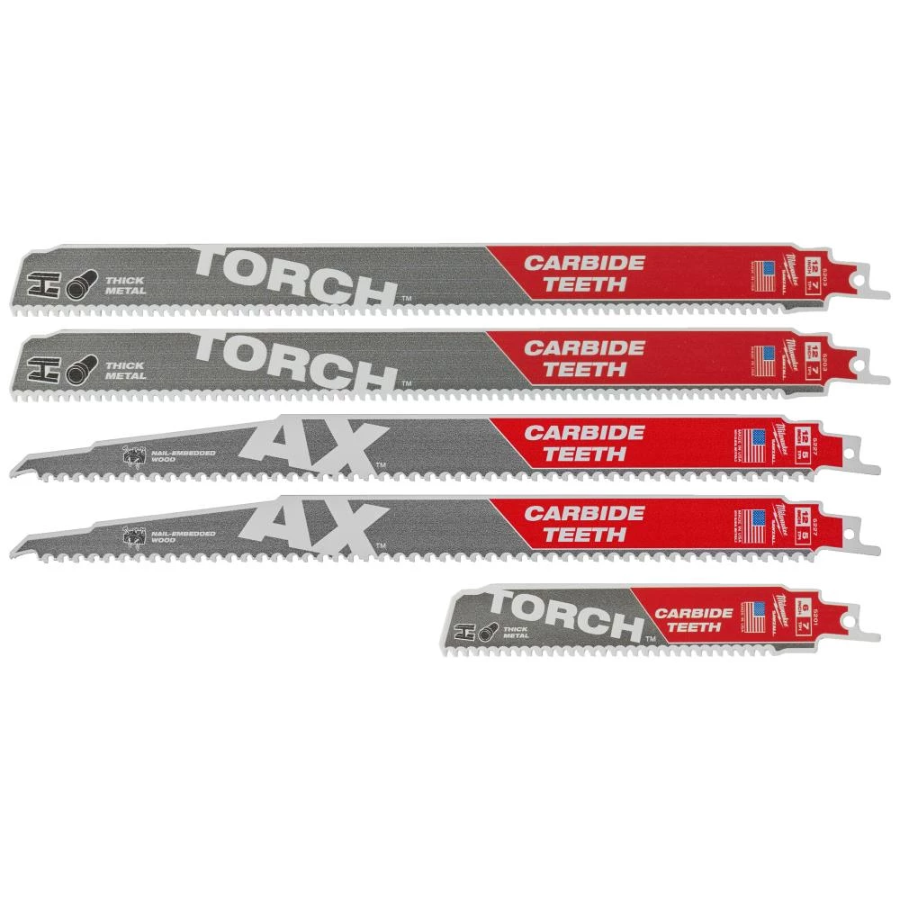 Bajonetsavbladpakke med fem stk. assorterede bajonetsavblade til nedrivning. Til træ med søm 2× AX karbid 230 mm. Til metal 2× Torch karbid 230 mm og 1× Torch karbid 150 mm.