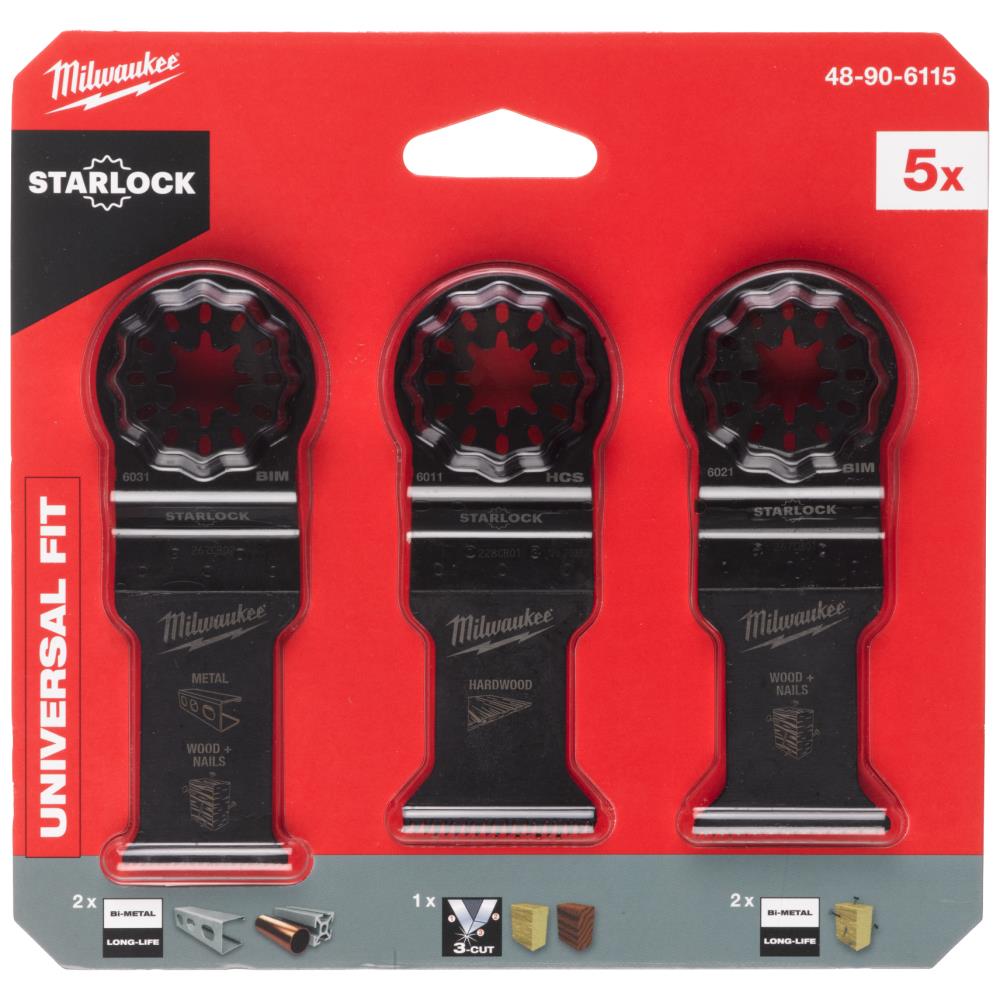 Multitool træ- og metalklingesæt. Indhold: 1× 35 mm dyksavsklinge til blødt og hårdt træ med 3-tands geometri, 2× 35 mm dyksavsklinge i Bimetal til træ og søm, 2× 28 mm multi-dyksavsklinge.
