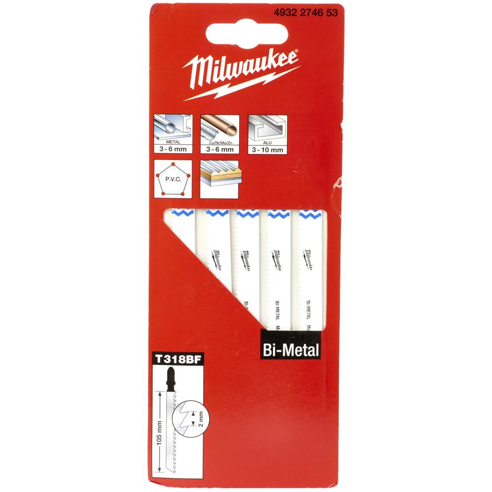 Stiksavblad T318BF 105/2 mm pk/5. Fleksibel og brudsikker stiksavsklinge i bimetal fremstillet af højhastighedsstål med en skærekant, der er elektrovejset på en fleksibel bagside af stållegering, hvilket giver et ekstra hårdt skær. Specielt designet til hurtig skæring og krævende opgaver med savning i metal, ikke-jernholdigt metal og aluminium. Klingen har høj slidstyrke og modstandsevne mod varme, som sikrer at tænderne holder sig skarpe længere. Dobbelt levetid i forhold til traditionelle HSS-klinger. Design med T-fæste, som passer til de fleste kendte mærker foruden Milwaukee f.eks. AEG, Bosch, DeWalt, Festool, Hitachi, Hilti, Mafell, Metabo, Ryobi.