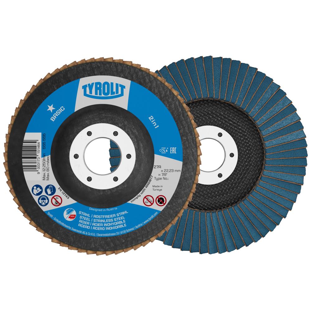 Basic* 2-i-1 lamelrondel til slibeopgaver på stål og rustfrit stål. Form 27CLA med bærekrop i glasfiber – denne form bestemmer den optimale slibevinkel på 15-20°. Høj hastighed for fjernelse af materiale. Effektiv og holdbar. Fås i flere størrelser og varianter. Kornstørrelse 40/60 til fjernelse af meget materiale – kornstørrelse 80/120 til fint arbejde.