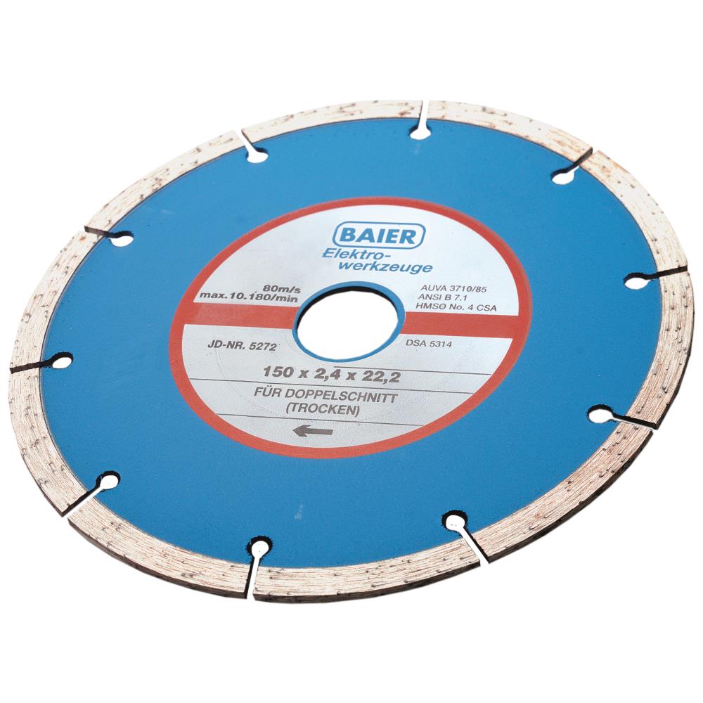 Blå, lasersvejset diamantskive til tør-vådskæring i hårde materialer som beton, armeret beton, frilagt beton og kalksten. 10 mm segment og 22,2 mm centerhul. Fås i hhv. ø150 mm og ø185 mm.