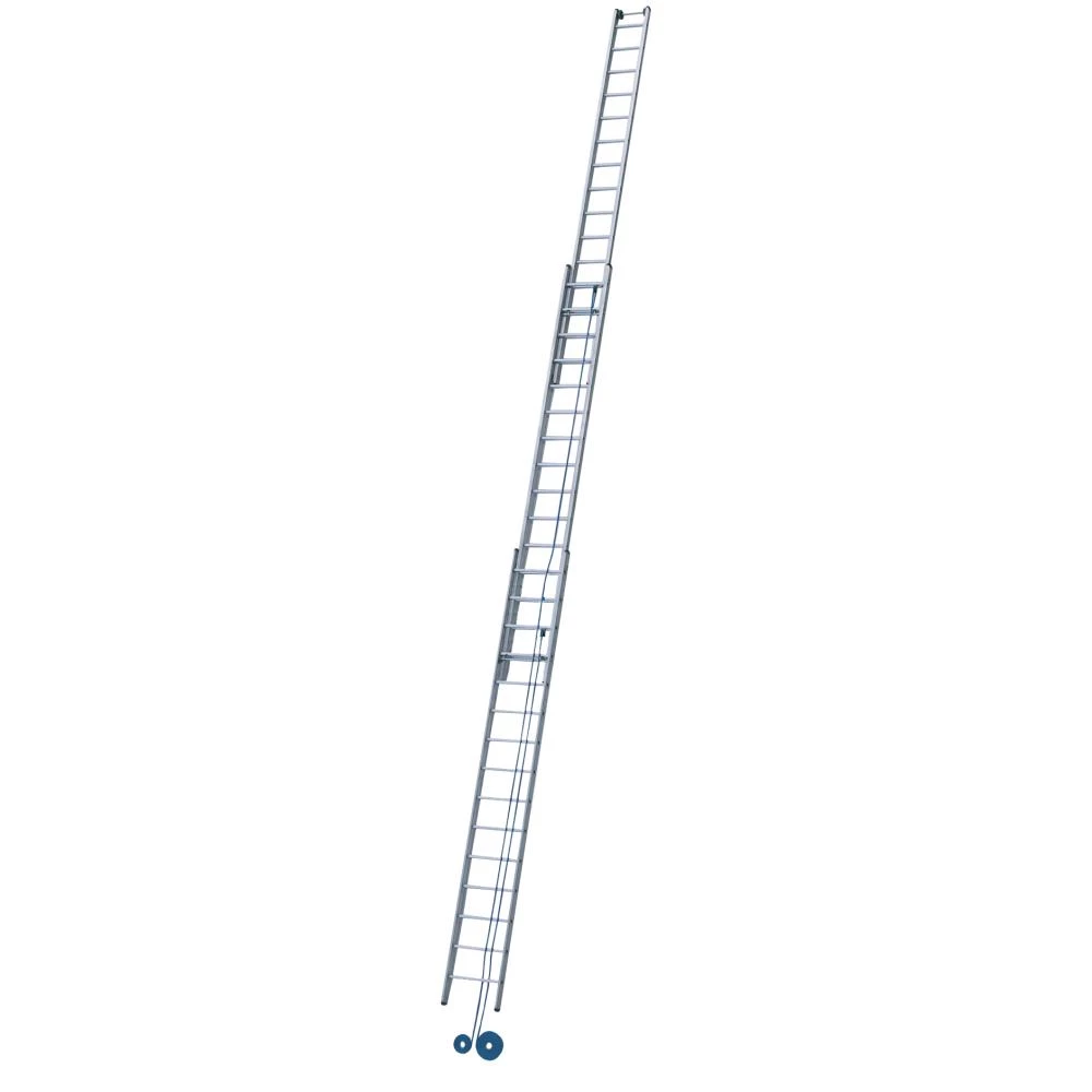 Hejsestige Skyline 3E er optimal i arbejdshøjder op til 16,35 mtr. Udstyret med tophjul med gummibane der skåner overfaden. Højdeindstilling af midter- og overstigen ved hjælp af to hejsetræk. Højdeindstilling fra trin til trin med 280 mm ad gangen. Stigerne med bestillingsnr. 40448 og 40449 er udstyret med 2 støtteben til bekvem opsætning og støtte. (Kan ikke anvendes fritstående). Sikker fastlåsning ved hjælp af automatiske indfaldskroge. Nylonglidere i topbeslag og toptrin gør stigen ekstra let at betjene. Udskiftelige stigesko for skridsikker stabilitet. Trin og vanger af ekstruderede aluminiumprofler. 30×30 mm trin med riflet overflade. Fås i flere længder.
