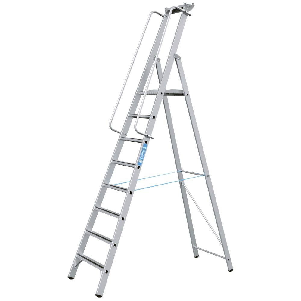 Meistertritt S trappestige med gelænder. Trin med Safer Step Teknologi. Stor ståplatform med anti-slip overflade. EN 131 professional. Fås i flere varianter.