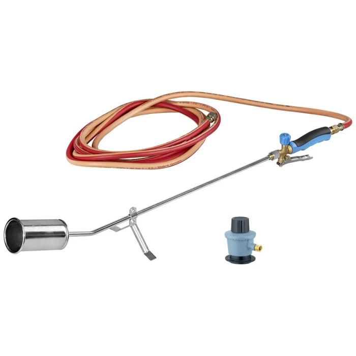 Ukrudts- og tagpapbrænder til lægning af tagpap, opvarmning, fjernelse af ukrudt, tørring af beton og murværk m.m. 60 mm stormbrænder med 560 mm halsrør. Justerbar flamme. Tilslutning 3/8″. Inkl. støtteben, 5 mtr. slange (20 bar) og PRO regulator.