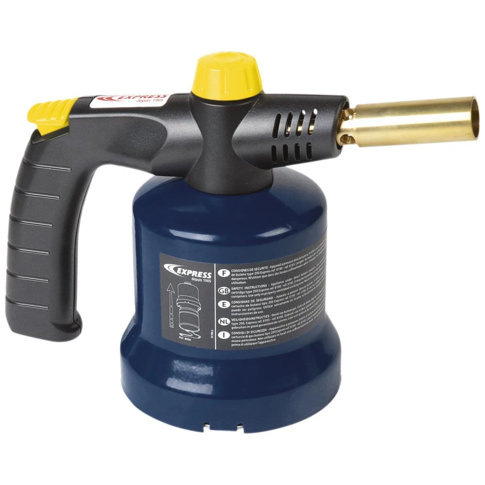 Blæselampe med Piezotænding, ergonomisk håndtag og metalklokke til beskyttelse af gasbeholderen. Forbrug 110g/time. Kapacitet 1,5kW. Flamme ø6×60 mm. Brænder ø16 mm. Maks. temp. ca. 1.800°.